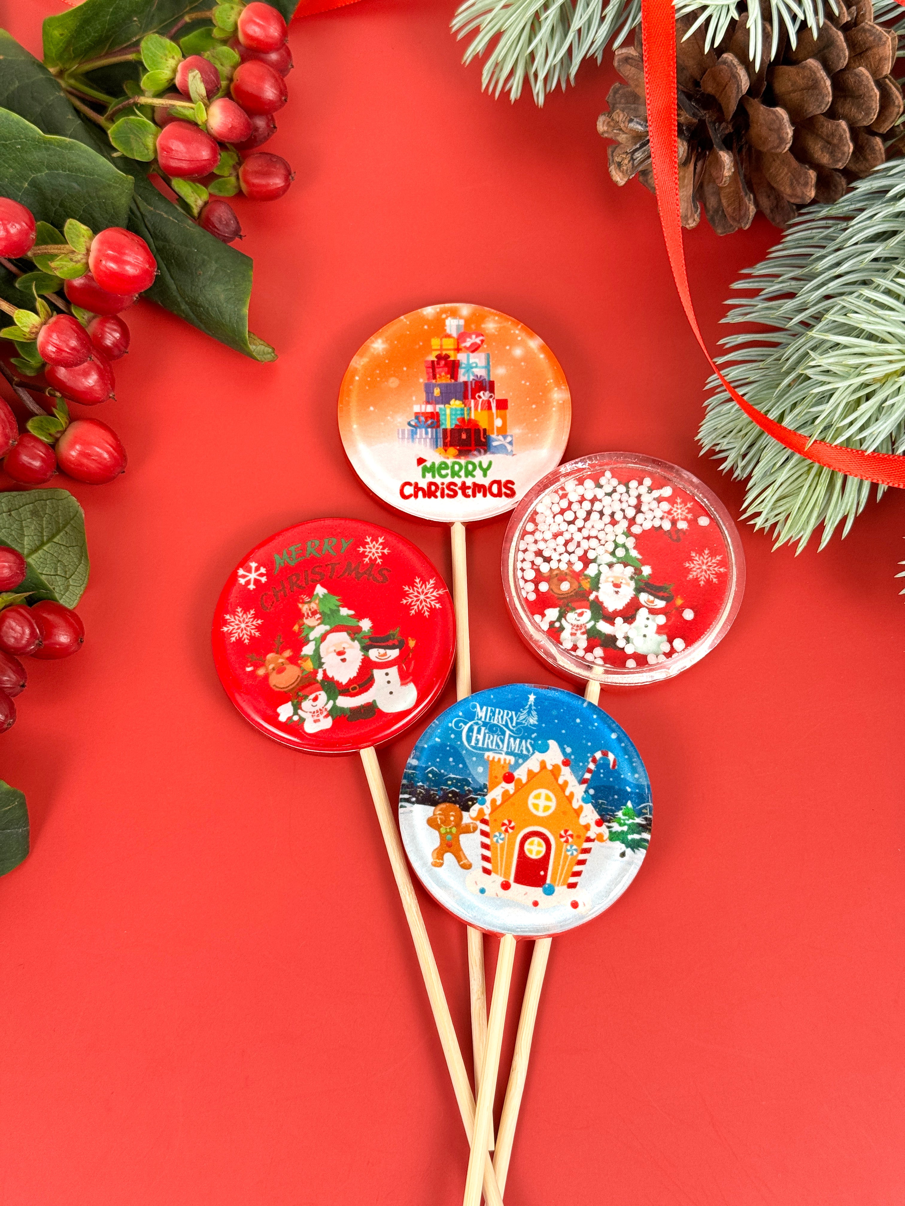 We create crystal-clear lollipops with personalized artwork, wedding monograms, baby shower themes, cartoon characters, corporate designs, and more. Every piece is made individually: we develop the design, print edible images, prepare colors, and craft each lollipop by hand. Nothing here is mass-produced — every order is unique.